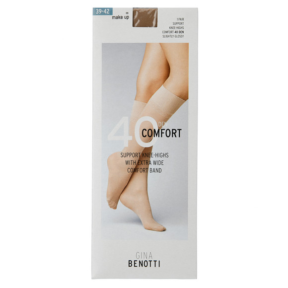 Klassische Kniestrümpfe in Make up in leicht glänzender Optik. Mit extrabreitem Komfortbund und verstärkter Spitze. Vitalisierend und verringert das Anschwellen der Beine. 40 DEN.