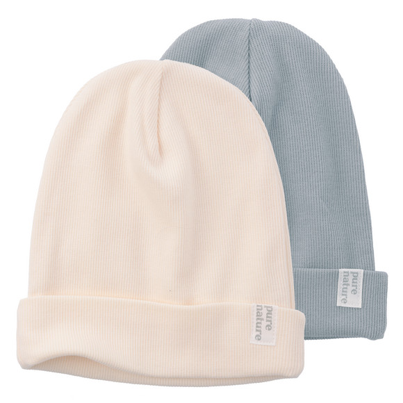 Zwei gerippte Beanies in uni Blaugrau und Cremeweiß. Doppellagig gearbeitet mit breiten Umschlag und kleinem "pure nature"-Label.