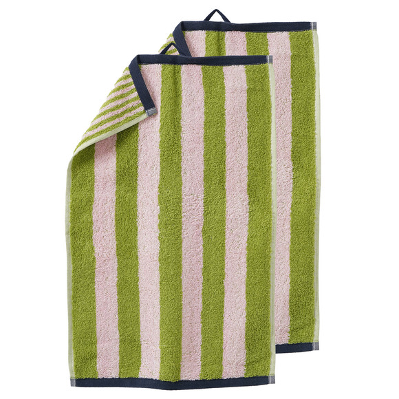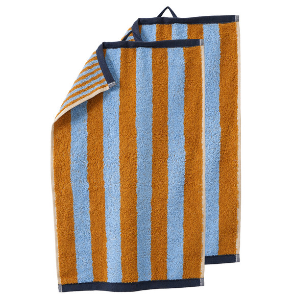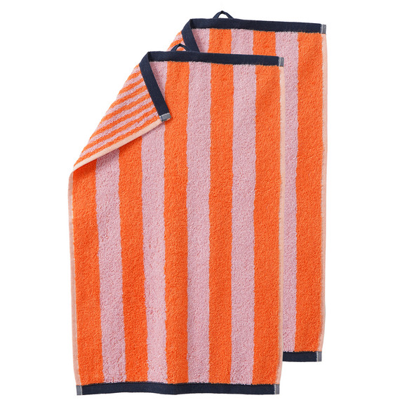 Zwei orangefarbene Gästetücher aus weicher Frottee-Qualität mit rosa Blockstreifen auf der Vorderseite, sowie feinen rosa Streifen auf der Rückseite. Abschlüsse gesäumt und mit praktischer Schlaufe zum Aufhängen.