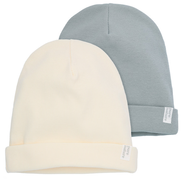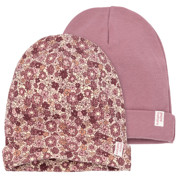 Zwei gerippte Beanies in uni Dunkelrosa und in Cremeweiß mit kleinen Blümchen allover bedruckt. Doppellagig gearbeitet mit breiten Umschlag und kleinem "pure nature"-Label.