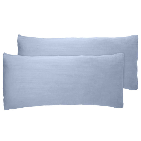 Schlicht und gemütlich! Zwei Kissenhüllen aus weichem Musselin in Hellblau. Aus angenehmer Bio-Baumwolle. Mit Hotelverschluss. Maße je ca. 40 x 80 cm (BxH).