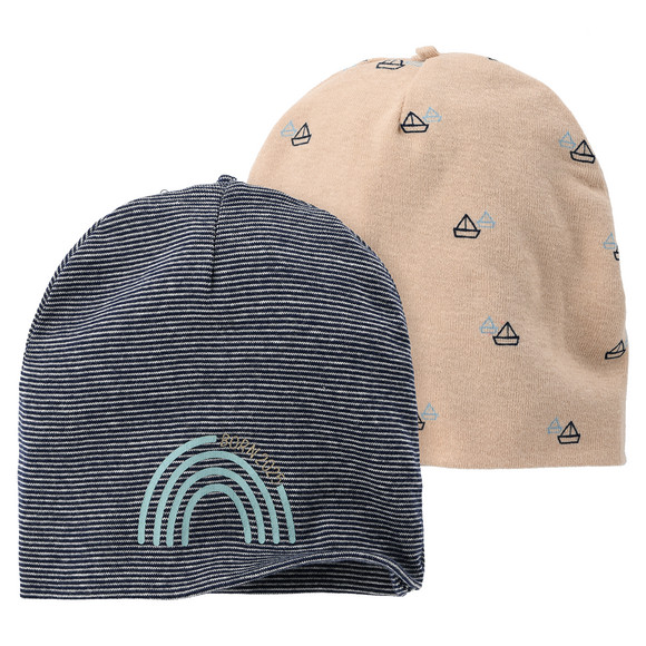 Willkommen kleiner Engel! Zwei doppellagige Mützen, eine Variante in Dunkelblau gestreift mit Schriftzug "Born 2025" und die andere Variante in Beige mit Segelboot-Motiven allover.
