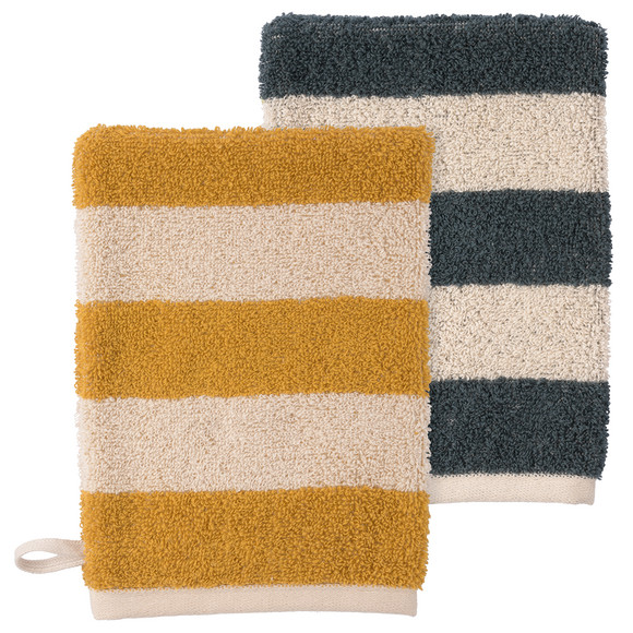 Zwei Waschhandschuhe in Cremeweiß aus weicher Frottee-Qualität mit bunten Streifen auf der Außenseite und auf der Innenseite. Abschlüsse gesäumt und mit praktischer Schlaufe zum Aufhängen. Maße ca. 15 x 21 cm (BxL).
