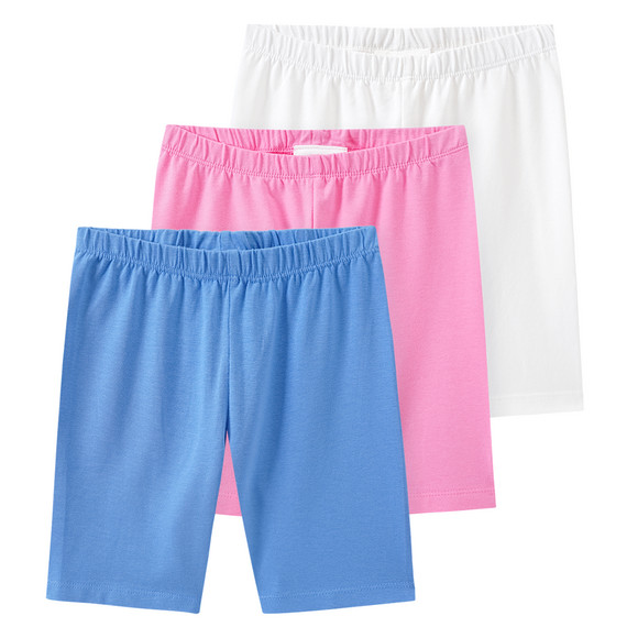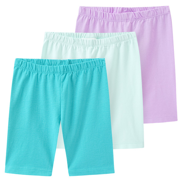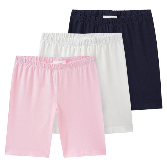 Dreierpack Radler-Leggings in unifarben Weiß, Blau und Rosa. Jeweils mit elastischem Bund für einen bequemen Sitz.