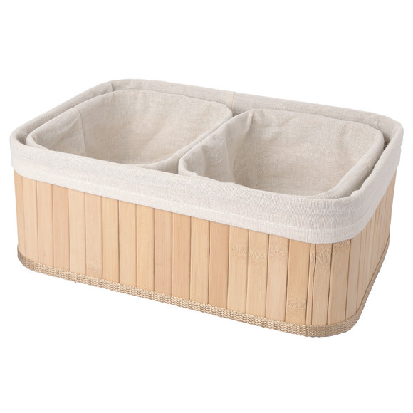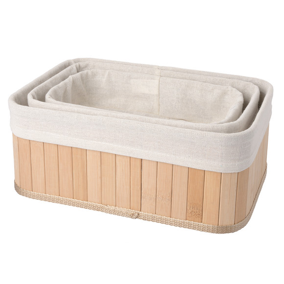 Drei rechteckige Körbe aus Bambus mit gerundeten Ecken. Abnehmbares Futter aus Webstoff in Hellbeige (Handwäsche möglich). Drei verschiedene Größen - ein großer Korb ca. 30 x 20 x 12 cm, ein mittelgroßer Korb ca. 28 x 18 x 10 cm und ein kleiner Korb ca. 25 x 14 x 8 cm.