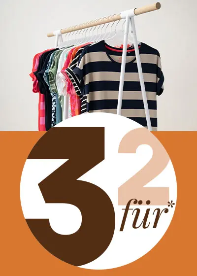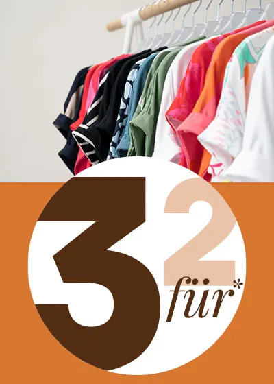 Der Rabatt gilt ab dem 05.01.2026 auf alle mit "3 für 2" gekennzeichneten Damen-Artikel und nur solange der Vorrat reicht. Beim Kauf der Mindestanzahl an Artikeln wird der günstigste Artikel auf die aktionsberechtigten Artikel angerechnet. Gültig im Online Shop, in der App und in allen Filialen von Ernsting's family. Der Rabatt gilt nicht für Gutscheine und Versandkosten. Internetpakete können nicht nachträglich bei Abholung in der Filiale rabattiert werden. Nicht kombinierbar mit anderen (Aktions-)Rabatten. Der Rabatt wird automatisch am Ende des Bezahlvorgangs abgezogen.