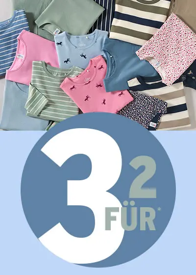 Der Rabatt gilt ab dem 14.01.2026 auf alle mit "3 für 2" gekennzeichneten Kinder-Artikel und nur solange der Vorrat reicht. Beim Kauf der Mindestanzahl an Artikeln wird der günstigste Artikel auf die aktionsberechtigten Artikel angerechnet. Gültig im Online Shop, in der App und in allen Filialen von Ernsting's family. Der Rabatt gilt nicht für Gutscheine und Versandkosten. Internetpakete können nicht nachträglich bei Abholung in der Filiale rabattiert werden. Nicht kombinierbar mit anderen (Aktions-)Rabatten. Der Rabatt wird automatisch am Ende des Bezahlvorgangs abgezogen.