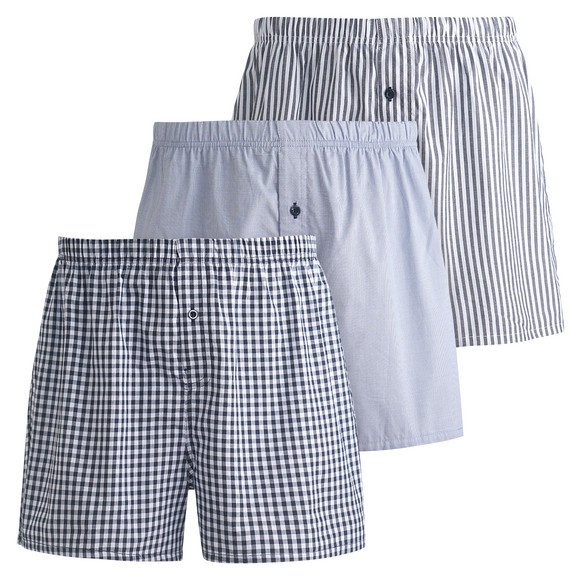 Drei Boxershorts in unteschiedlichen Dessins. Weiß mit dunkelblauen Karos, Weiß mit dunkelgrauen Streifen und feines Hahnentrittmuster in Weiß und Hellgrau. Mit einfach geknöpftem Eingriff vorne und Elastikbund.