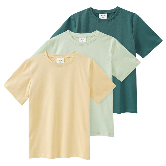 Drei T-Shirts in unifarben Dunkelblau, Salbei und Weiß. Mit elastischem Rundhalsausschnitt.