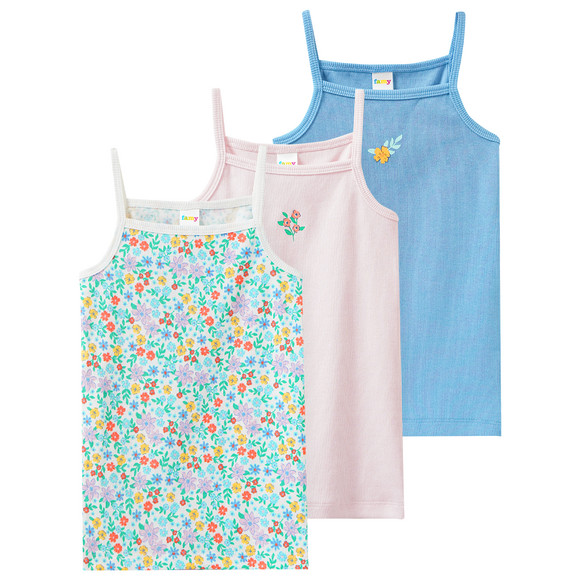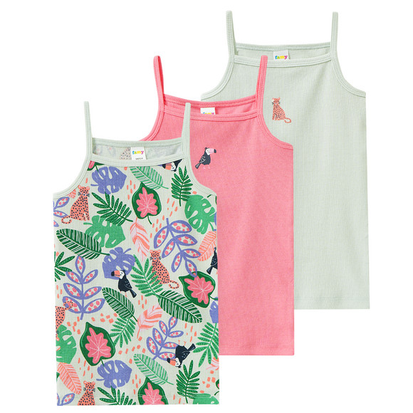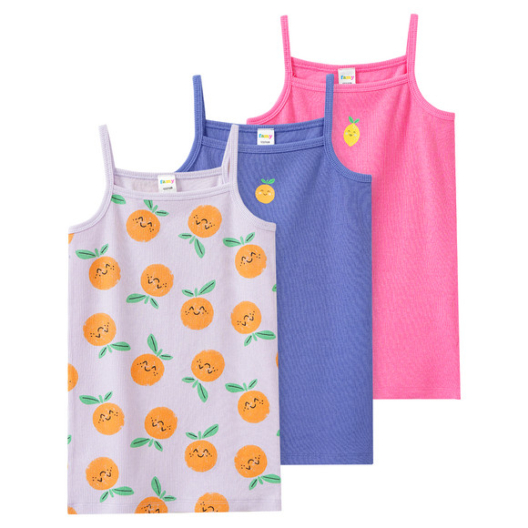 Dreierpack Unterhemden mit feiner Rippstruktur. Helllila mit lachenden Orangen allover, Pink und Lila mit Obst-Print vorne. Je mit geradem Ausschnitt und schmalen Trägern.