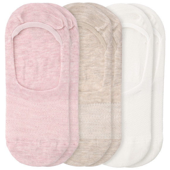 Drei Paar Füsslinge in uni Beige, Rosa und Weiß aus atmungsaktivem Mikro-Mesh. Leicht ausgeschnitten, dadurch unsichtbar im Schuh. Mit Anti-Slip-Gummierung im Fersenbereich für einen guten Sitz.