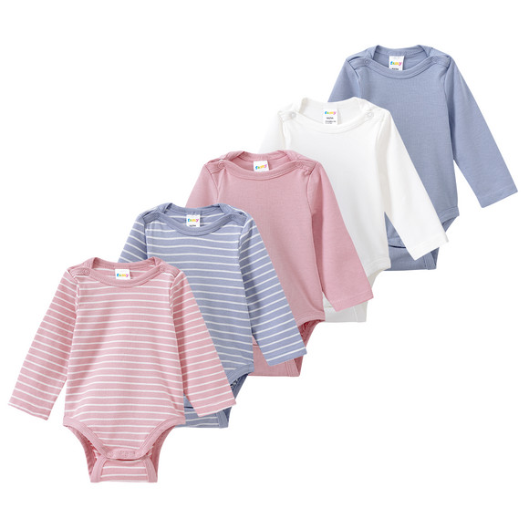 Fünf Langarmbodys in Rosa, Hellblau und Weiß. Zwei mit weißen Querstreifen und drei unifarbene. Je mit beidseitiger Schulterknöpfung und praktischen Druckknöpfen im Schritt.