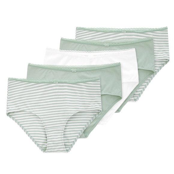 Fünferpack Pantys in unifarben Salbei und Weiß, sowie Salbei-Weiß gestreift. Je mit dezenter Spitze am Bündchen und Zierschleife vorne. Im Schritt doppellagig geschnitten.