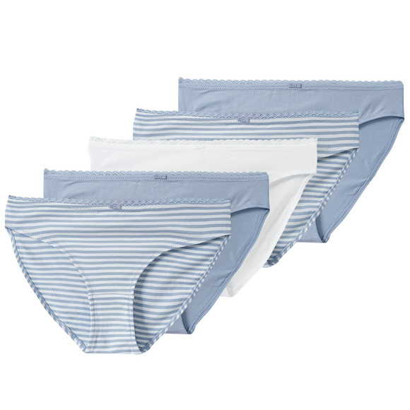 Fünf Slips in verschiedenen Dessins in Hellblau und Weiß. Drei unifarbene Slips und zwei mit Streifen-Dessin. Je mit elastischem Bund mit zarter Spitzen-Applikation. Im Schritt doppellagig geschnitten.
