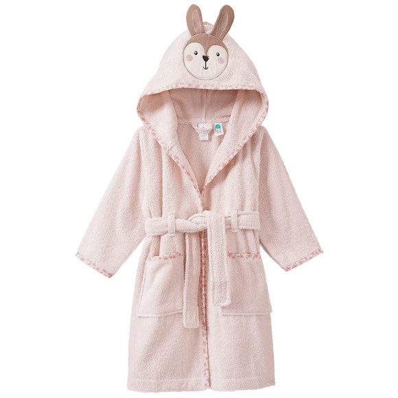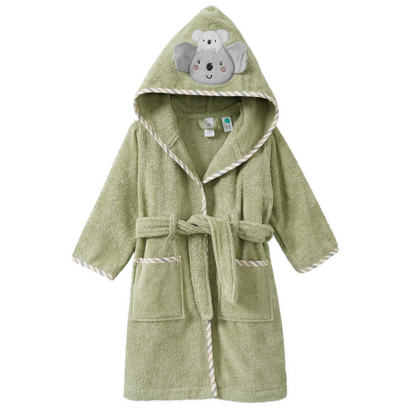 Hellgrüner Bademantel aus weichem Baumwoll-Frottee mit niedlicher Koala-Applikation an der Kapuze. Mit Bindegürtel in vier Gürtelschlaufen und zwei Einschubtaschen. Paspelierte Abschlüsse mit Streifen.