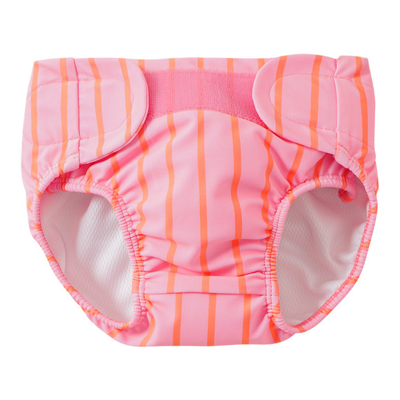 Rosa Badehose mit orangen Streifen und Schriftzug "Coconut Beach" hinten. Mit integriertem Windeleinsatz und Klettverschluss am Bund für einen optimalen Sitz. Elastischer Bund im hinteren Bereich und elastische Beinausschnitte. Komplett weich gefüttert. Besonders nachhaltig, da keine zusätzliche Wegwerfwindel nötig ist.