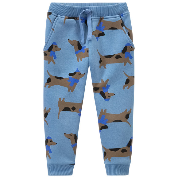 Blaue Jogginghose mit Dackel-Allover. Mit Tunnelzug im Elastikbund und gerippten Bündchen an den Beinausschnitten. Zwei Einschubtaschen vorne. Innen kuschelig weich angeraut.