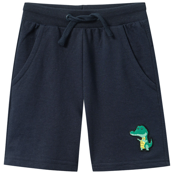 Dunkelblaue Joggingshorts mit Schiff-Applikation am Bein. Mit breitem Elastikbund und Tunnelzug. Vorne mit zwei Eingrifftaschen und hinten eine aufgesetzte Tasche.