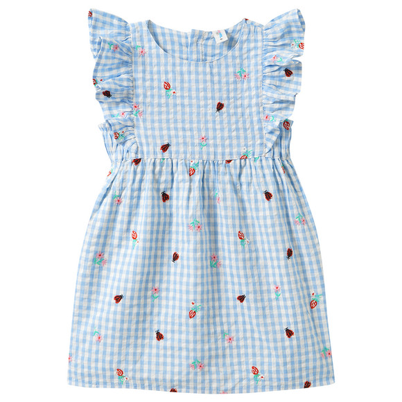 Hellblau-weiß kariertes Kleid mit strukturiertem Material aus Baumwolle. Mit Erdbeeren, Blumen und Marieknäfern bestickt. Rundhalsausschnitt und kurze Knopfleiste hinten. Rüschen an den Armausschnitten. Ausgestelltes Rockteil mit Unterrock.