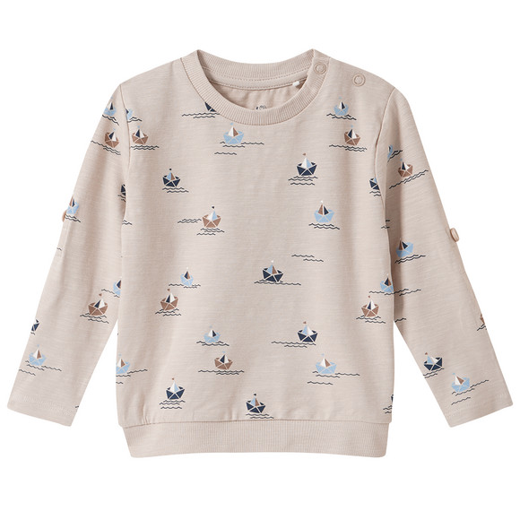 Beiges Langarmshirt mit bunten Schiffchen-Motiven allover. Geripptes Bündchen am Rundhalsausschnitt sowie am Saum. Mit praktischer Schulterknöpfung und Turn-up Ärmeln.