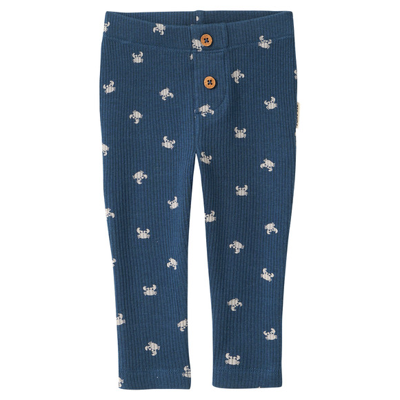 Dunkelblaue Leggings mit Rippstruktur und Krabben-Motiven allover bedruckt. Mit zwei Zierknöpfen auf der Vorderseite und elastischem Bund.