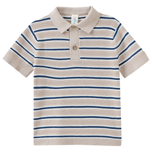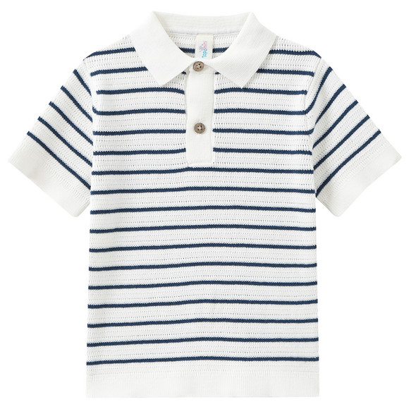 Poloshirt in Weiß mit Strickstruktur und blauen Streifen allover. Klassischer Polokragen mit doppelter Knopfleiste. Gerippte Abschlüsse an den Ärmeln und am Saum.