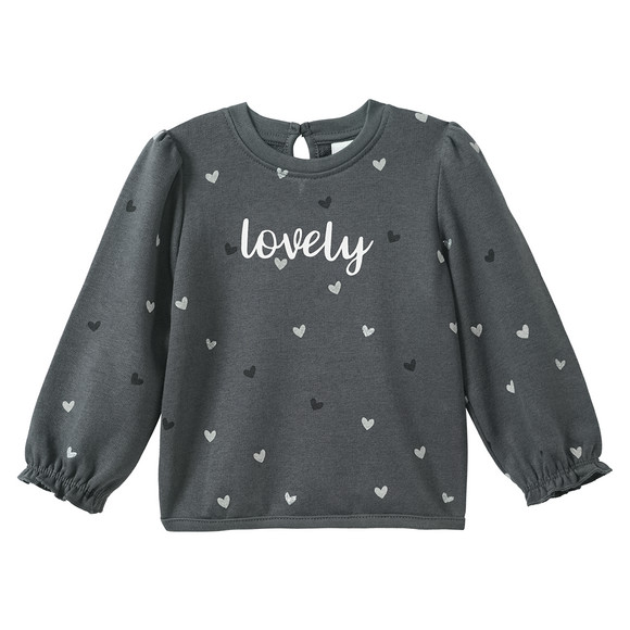 Leichtes Sweatshirt in Dunkelgrau mit hohem Anteil zertifizierter Bio-Baumwolle. Vorne mit Text-Print und allover mit Herzen bedruckt, teils glitzernd. Rundhalsausschnitt mit Cut-Out und Knopf im Nacken. Ärmel mit elastischen Ausschnitten. Innen angeraut.