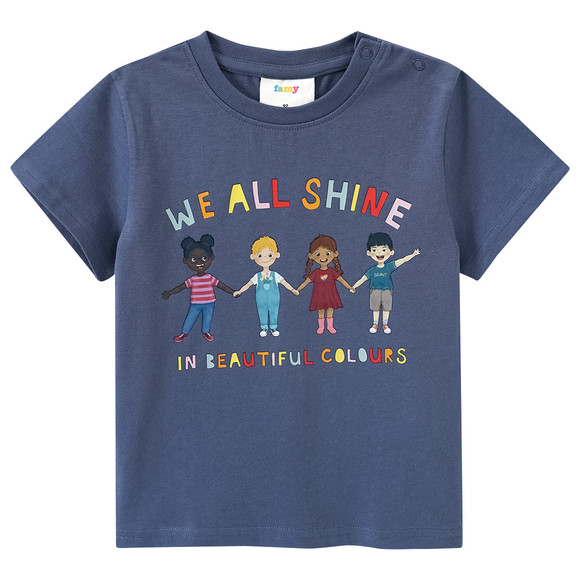Grünes T-Shirt mit Message-Print in bunten Farben auf der Front. Mit angesetztem Rippenbündchen am Rundhalsausschnitt, Druckknöpfen an der linken Schulter und geradem Schnitt.