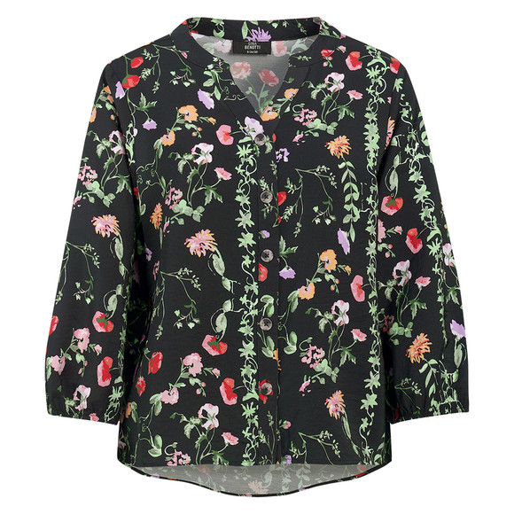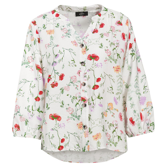 Weiße Bluse aus einem weichen Modal-Mix mit buntem Allover-Print. Mit kurzem Stehkragen, kurzem V-Ausschnitt, durchgängiger Knopfleiste und elastischen Bündchen an den 1/2 Ärmeln. Locker geschnitten.
