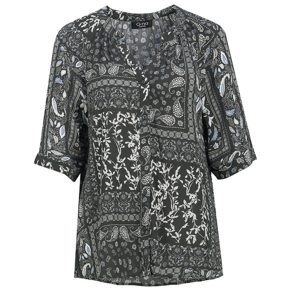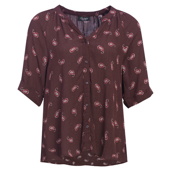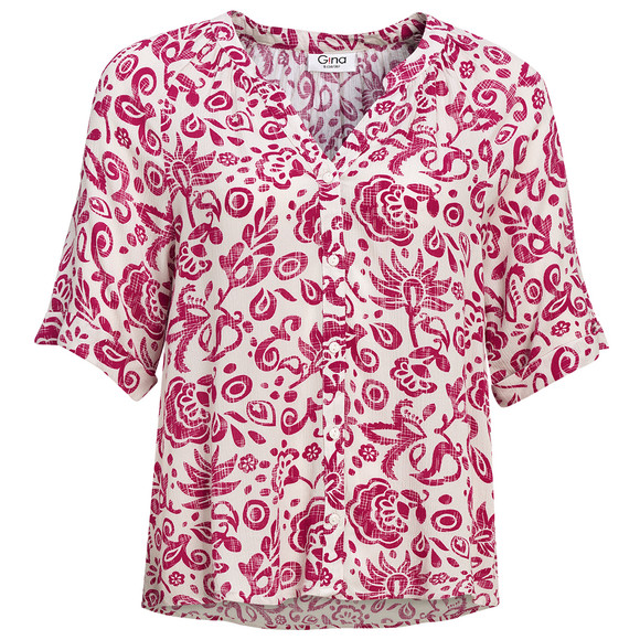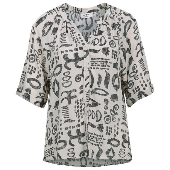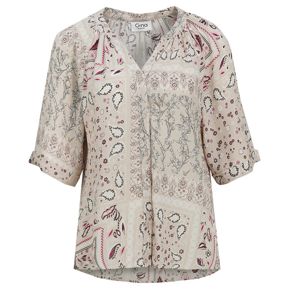 Beige Bluse mit buntem Allover-Muster aus angenehmer Viskose in gekreppter Optik. Rundhalsausschnitt mit V-Cut-Out und Knopfleiste. Kurze Ärmel mit fixierten Umschlägen für einen tollen Look.