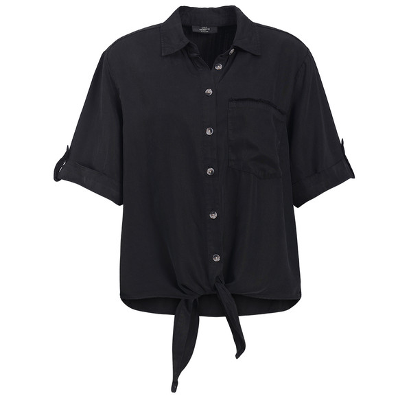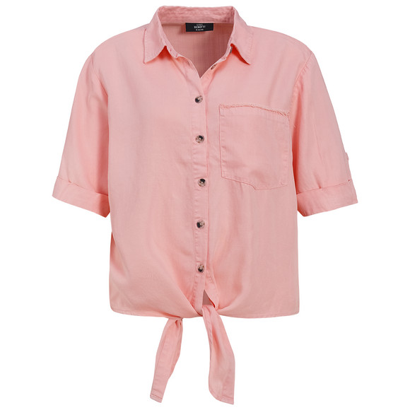 Bluse in Rosa mit kurzem Kentkragen, V-Ausschnitt, Knopfleiste und einer Brusttasche. Mit Zierriegeln an den fixierten Turn-ups an den kurzen Ärmeln. Vorne am Saum zum Knoten. Saum leicht abgerundet.