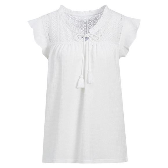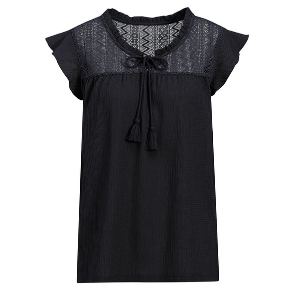 Schwarzes Blusenshirt aus strukturiertem Material. Rundhalsausschnitt mit Rüschen und Bindeband mit Tasseln vorne. Im oberen Bereich mit feiner Spitze und mit passenden Flügelärmeln.