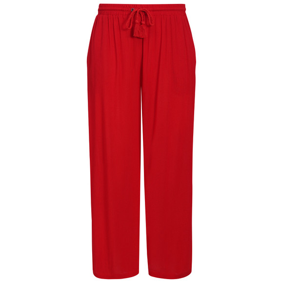 Rote Culotte in 3/4-Länge aus leichter Viskose in gekreppter Optik. Mit Tasseln am Tunnelzug im breiten Elastikbund für einen bequemen Sitz. Mit zwei Einschubtaschen vorne und imitierten Paspeltaschen auf dem Gesäß.