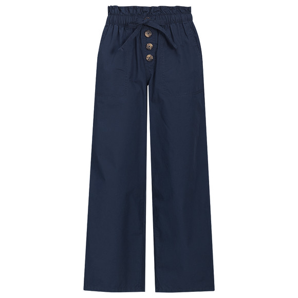 Leichte Culotte in Dunkelblau mit elastischem Paperbagbund, Tunnelzug und vier Zirknöpfe vorne. Zwei Einschubtaschen vorne und zwei aufgesetzte Taschen hinten.