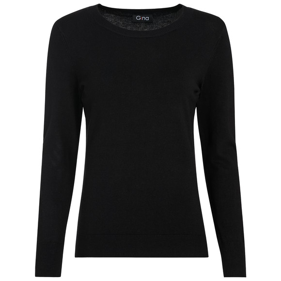 Strickpullover aus Feinstrick in unifarben Schwarz. Mit gerippten Bündchen am Rundhalsausschnitt, den Armausschnitten sowie Saum. Figurbetonte Passform mit hohem Viskoseanteil.