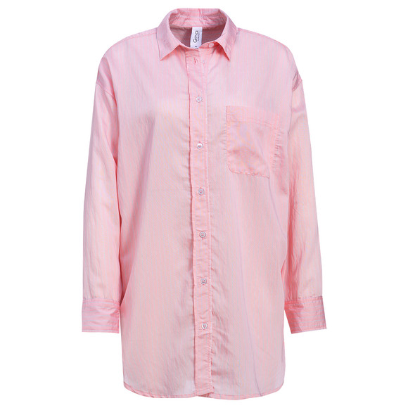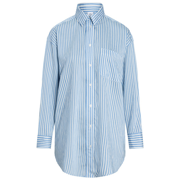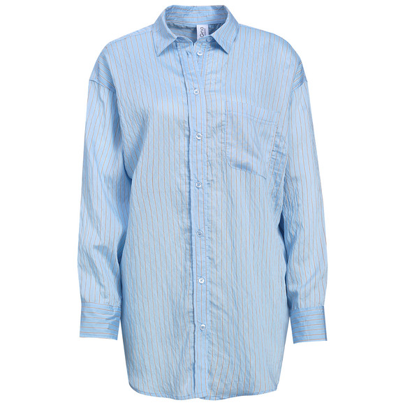 Hellblau-weiß gestreifte Bluse mit Hemdkragen, eine Brusttasche und Knopfleiste. Manschetten zweifach geknöpft und Saum abgerundet. Leichte Qualität.
