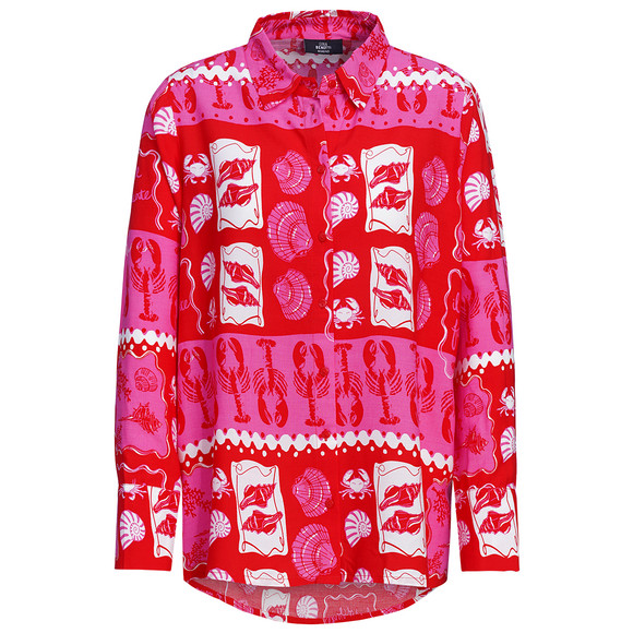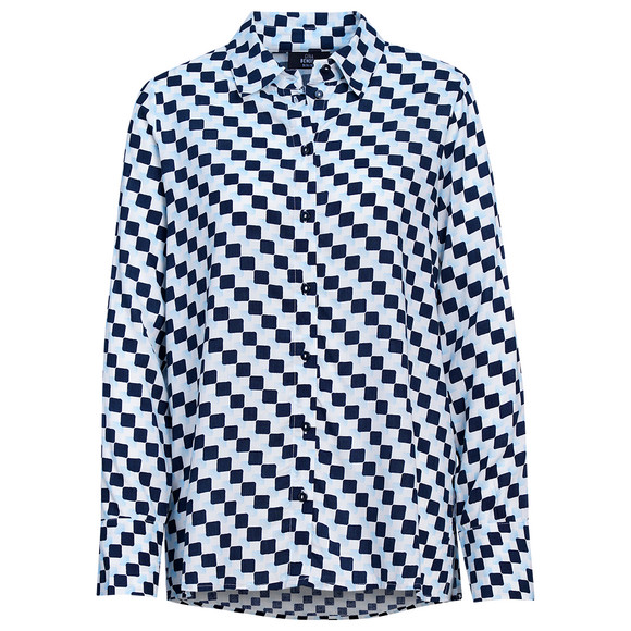 Dunkelblau-weiße Bluse mit Allover-Muster bedruckt. Mit Hemdkragen, Knopfleiste und zweifach geknöpften Manschetten. Leicht abgerundeter Saum hinten etwas länger geschnitten. Seitlich tief geschlitzt.