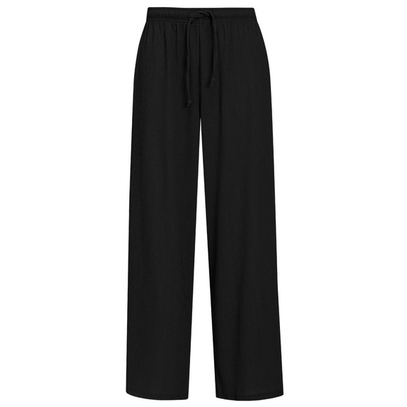 Schwarze Hose aus leichtem, strukturiertem Material, breitem elastischen Komfortbund und Tunnelzug.