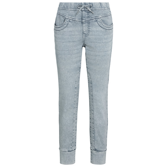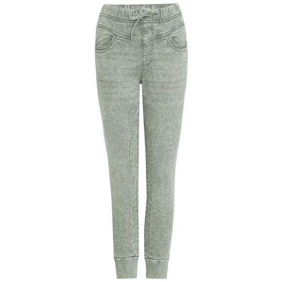 Hellgrüne Jeggings mit Used-Waschung und praktischem Tunnelzug im elastischen Bund. Vorne zwei Eingrifftaschen und hinten zwei Gesäßtaschen. Mit imitiertem Hosenschlitz sowie Ziernähten am Bund und am Bein. Breite angesetzte Bündchen an den Beinausschnitten. Besonders elastisches Material für einen bequemen Sitz.