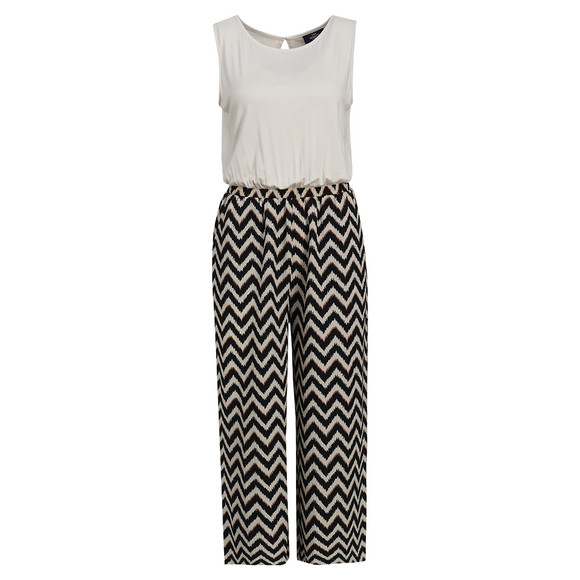 Jumpsuit mit beigem und ärmellosem Oberteil aus Jersey und Hosenteil mit schwarz-beigem Zick-Zack-Muster. Oberteil mit einfach geknöpftem Rückenschlitz und elastischer Einsatz in der Taille. Gerader und weit geschnittenes Hosenbein.