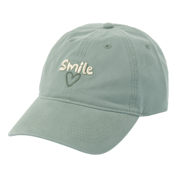 Olivgrüne Kappe mit gesticktem Schriftzug und Herz auf der Front. Mit verstärktem Schirm und am Hinterkopf stufenlos verstellbar.