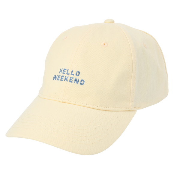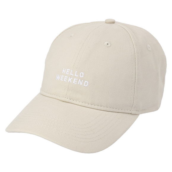 Beige Kappe aus angenehmer Baumwolle mit gesticktem Schriftzug "Hello Weekend" vorne. Mit verstärktem Schirm und am Hinterkopf in der Weite regulierbar.