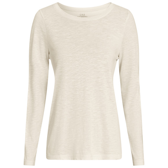 Cremefarbenes Langarmshirt in melierter Optik durch Flammgarn. Mit feinem Bündchen am Rundhalsausschnitt. Locker gerade geschnitten.