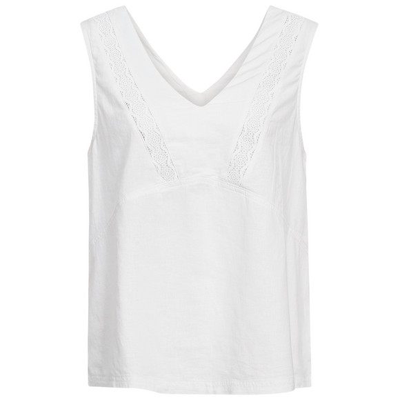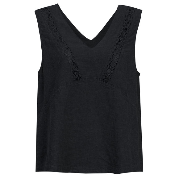 Ärmellose Bluse in Dunkelgrün mit hohem Leinen-Anteil und V-Ausschnitt. Vorne mit Einsätzen aus Häkelspitze verziert. Lockerer Schnitt.