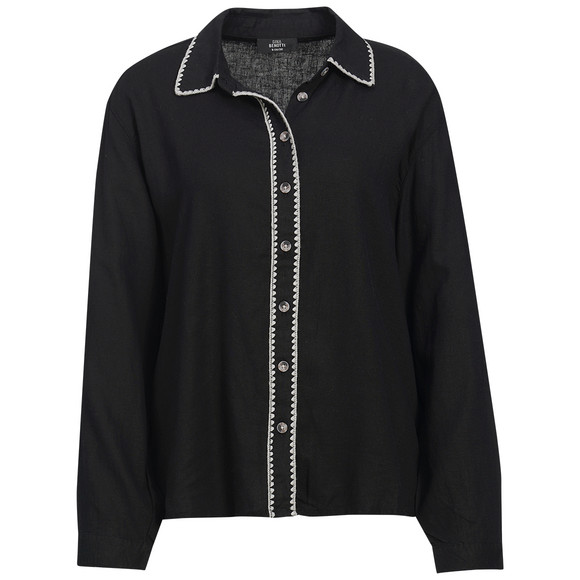 Beige Leinen-Bluse mit schwarzer Stickereibordüre am Hemdkragen und Knopfleiste. Lange Ärmel mit einfach geknöpften Armausschnitten.