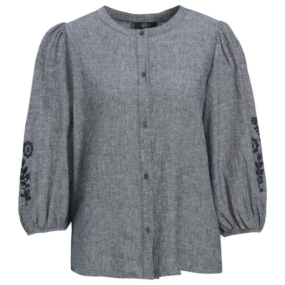 Dunkelblau melierte Bluse aus einem Leinen-Mix mit Rundhalsausschnitt und Knopfleiste. Mit Spitze an den weit geschnittenen Ärmeln und elastischen Bündchen.
