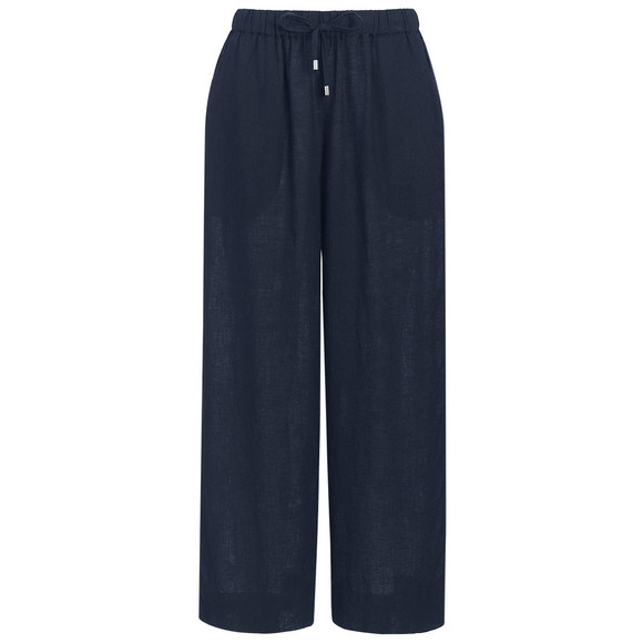 Dunkelblaue Hose aus einem angenehmen Viskose-Leinen-Mix mit Elastikbund und Tunnelzug. Zwei Einschubtaschen vorne. An den Beinen weit geschnitten.