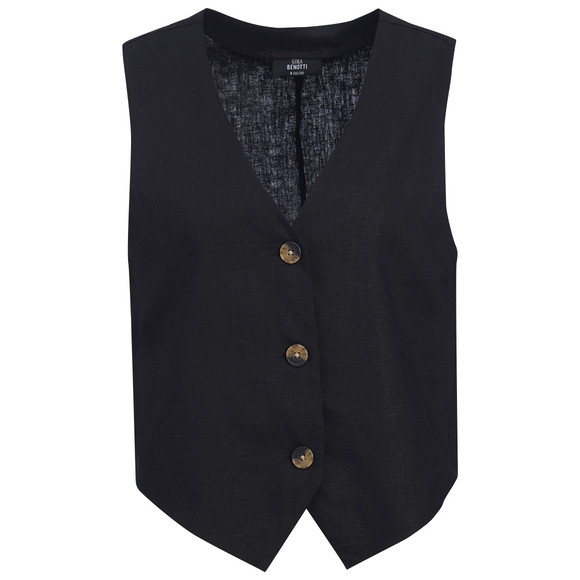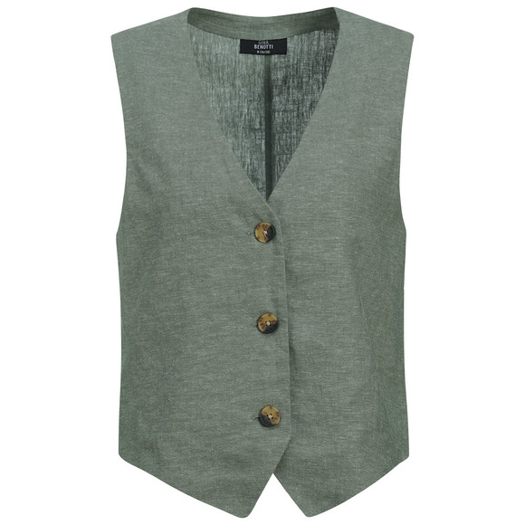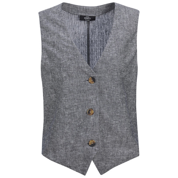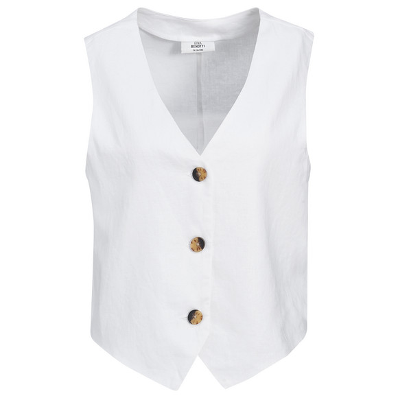 Weiße Weste mit hohem Leinen-Anteil, V-Ausschnitt und Knopfleiste. Im typischen Kellner-Style geschnitten.