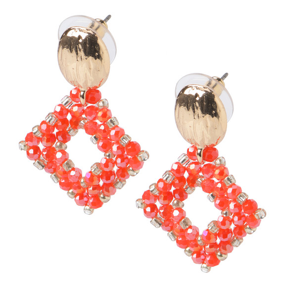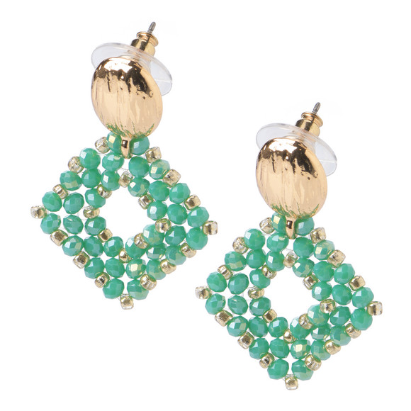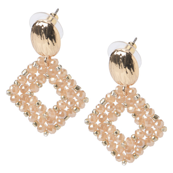 Leichte Ohrhänger aus beigen und golfarbenen Perlen in Rauten-Optik am goldfarbenen Element hängend. Mit praktischen Steckverschlüssen.