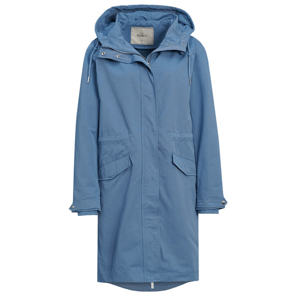 Blauer Parka mit Kapuze. Mit verdecktem Reißverschluss und Druckknopf an den Pattentaschen. Verstellbare Riegel an den Ärmeln sowie versteckte Bündchen. Hinten etwas länger geschnitten.